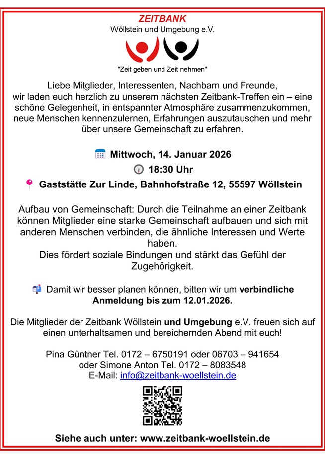 0172 – 6750191 oder 0172 – 8083548 oder per E-Mail: info@zeitbank-woellstein.de